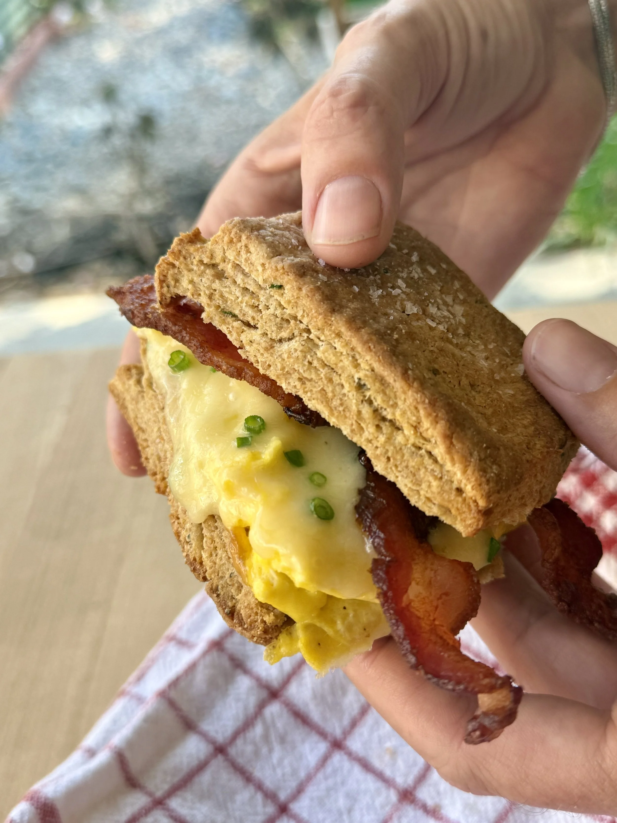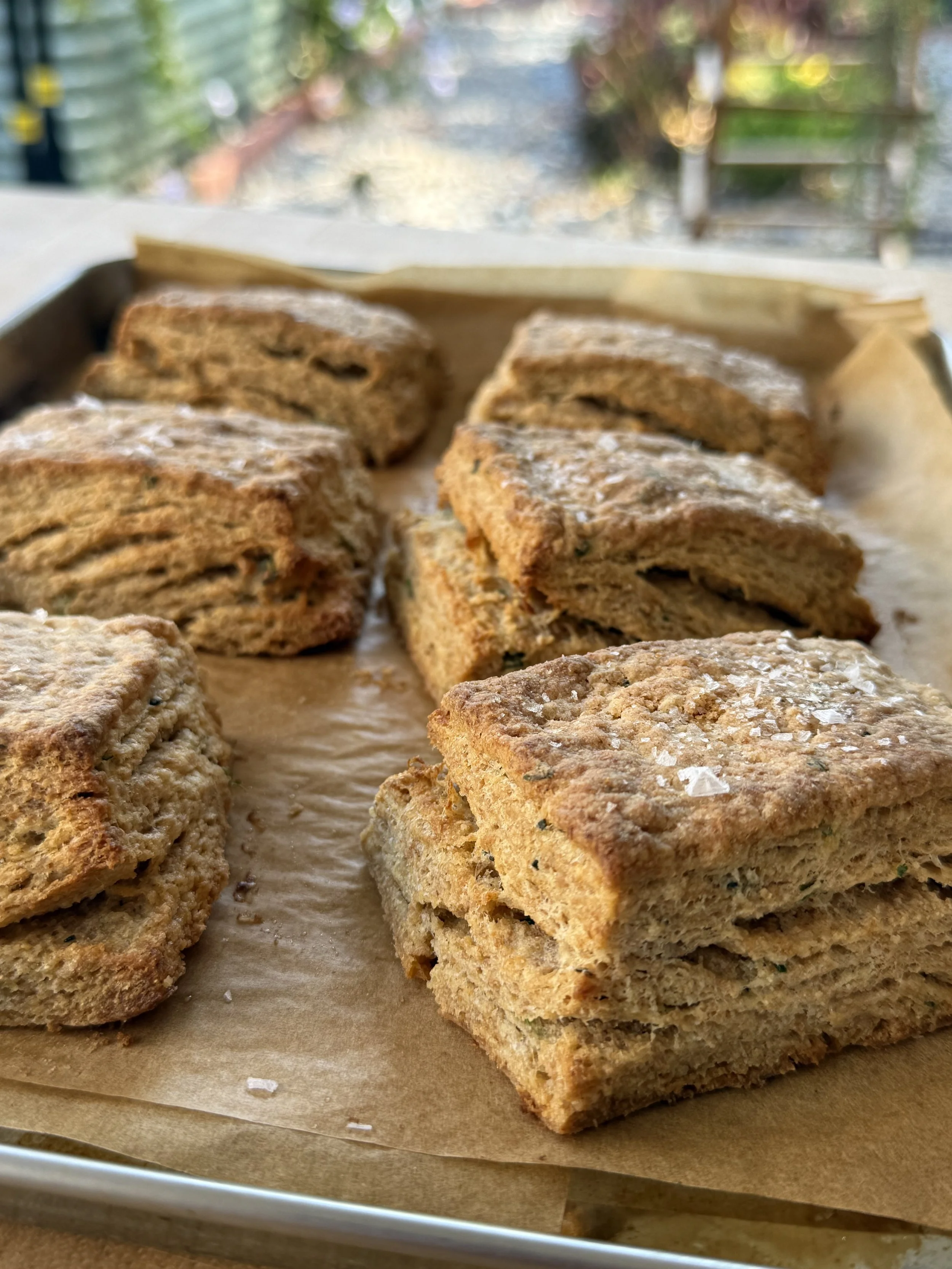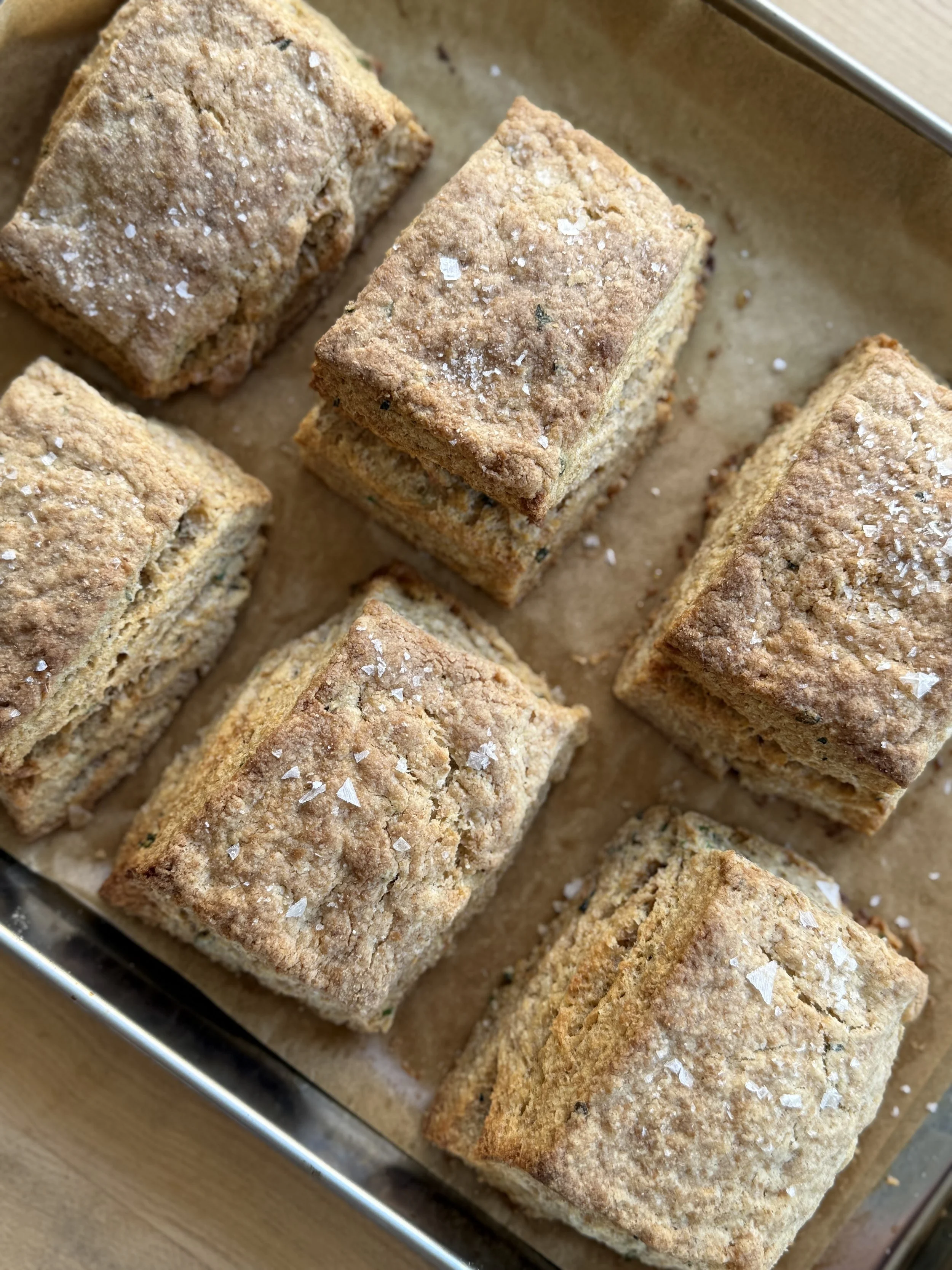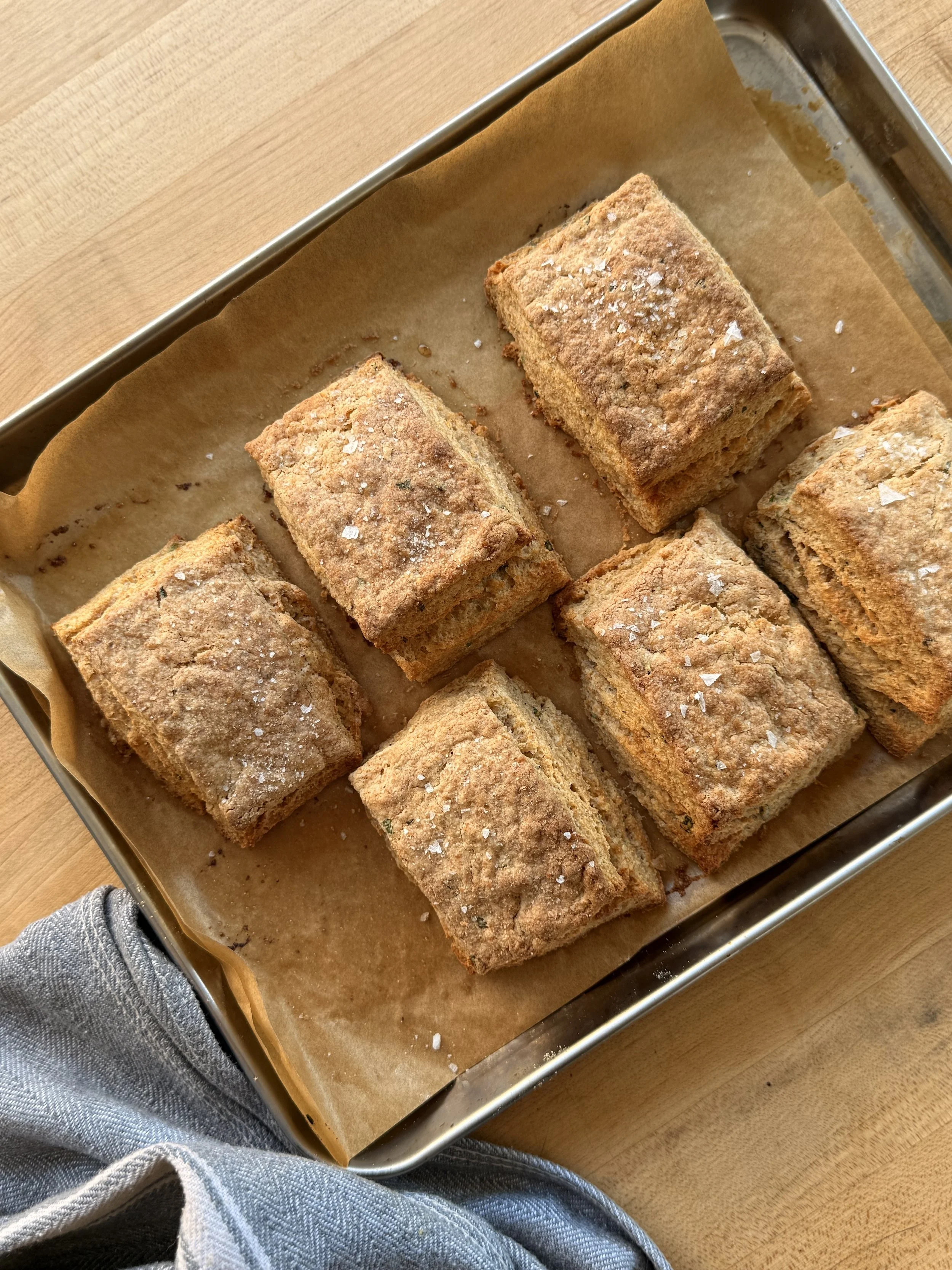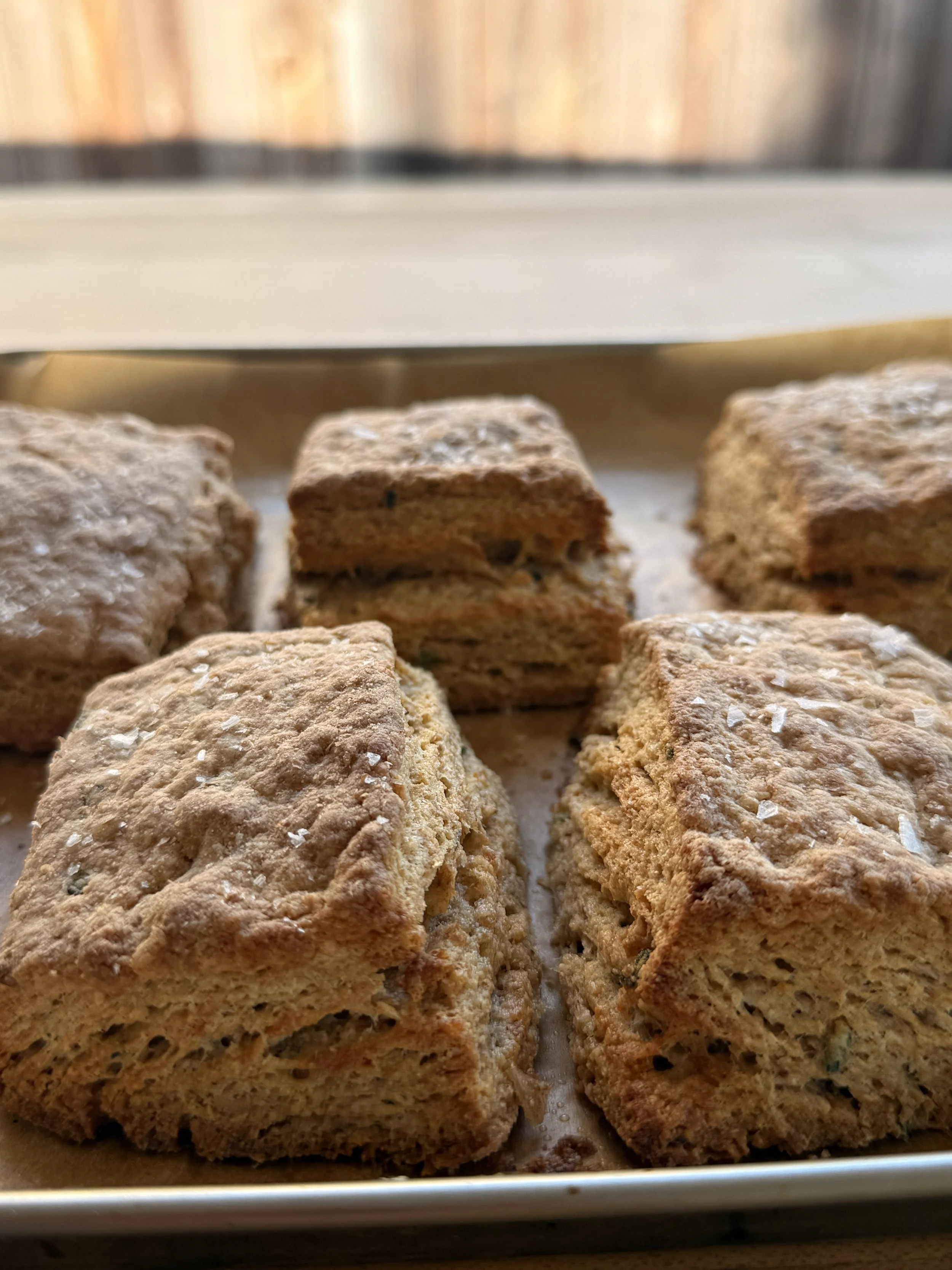 WE LOVE A GOOD COUNTRY STYLE ALL- BUTTER BISCUIT OVER HERE. MUST BE FROM OUR YEARS LIVING IN TEXAS. THE BEST BISCUITS ARE FLAKEY, BUTTERY, SALTY WITH A HINT OF ROSEMARY. THIS FRESH MILLED ANCIENT GRAIN BISCUIT IS DELICATE ENOUGH TO EAT ALONE WITH JUST A SPEAD OF HOMEMADE PRESERVES, BUT WILL ALSO HOLD UP AS A SANDWICH LAYERED WITH CHEESY FARM FRESH EGGS AND BACON. WE ADORE THE DEPTH OF FLAVOR FRESH MILLED SPELT ADDS, ELEVATING THE HUMBLE BISCUIT TO NEW LEVELS OF TASTINESS.