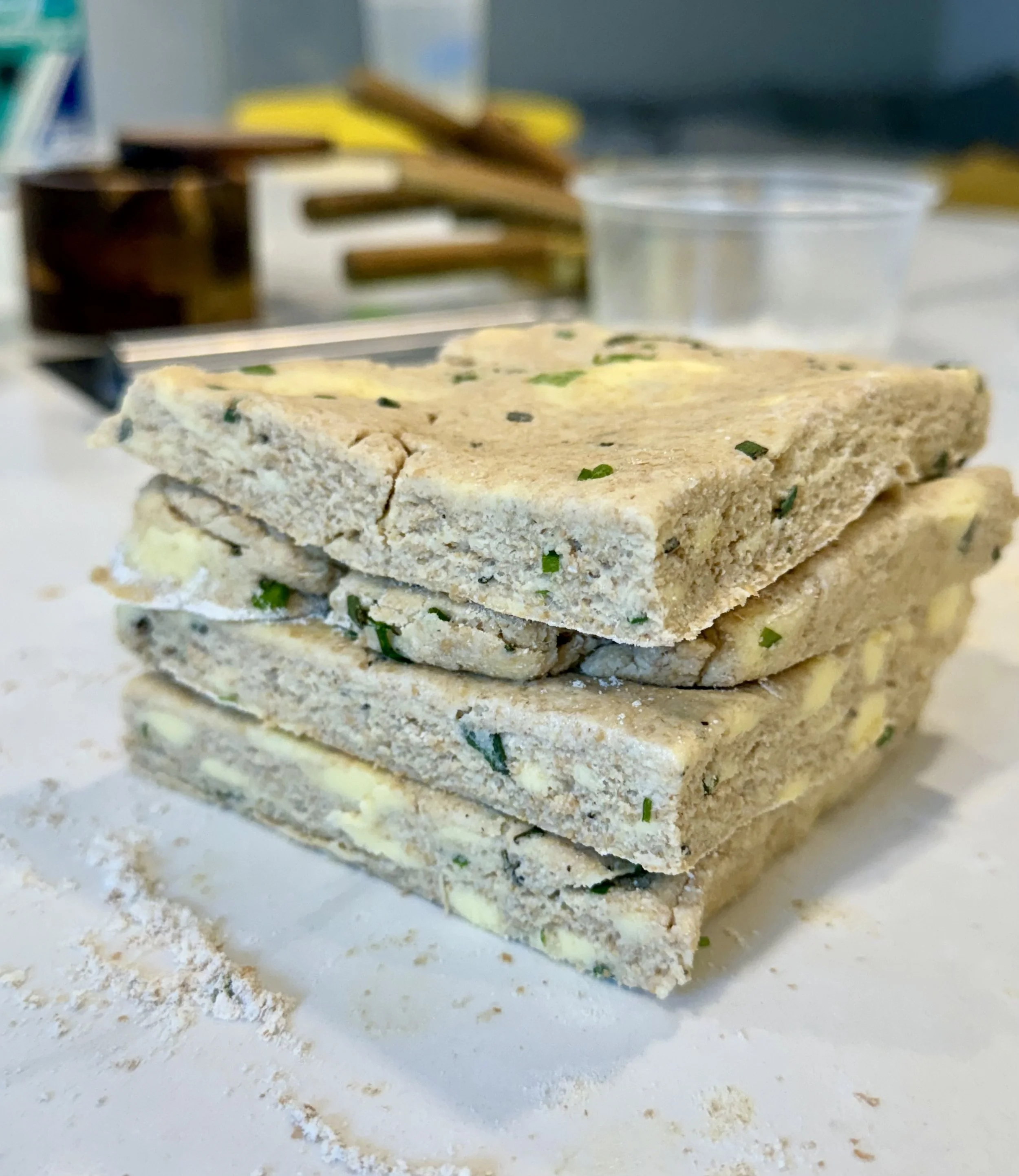 Shape: Turn dough onto a floured surface. Gently pat into a rectangle about 2 cm (¾ inch) thick. Fold in half, then pat down again. Repeat 2–3 times for flaky layers.